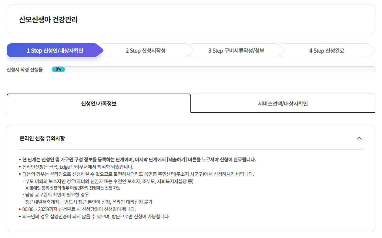 - 복지로 온라인 신청 경로: 복지로 로그인 > 서비스 신청 > 복지서비스 신청 > 복지급여 신청 > 임신출산 > 산모신생아 건강관리