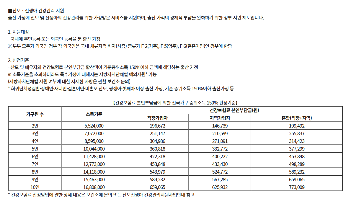 - 산모 및 배우자의 건강보험료 본인부담금 합산액이 전국가구 기준 중위소득 150% 이하에 해당하는 출산가정
