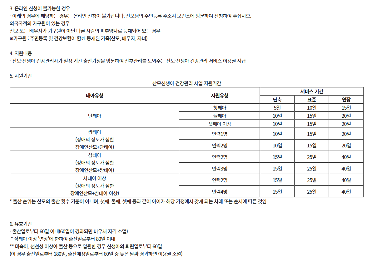- 산모, 신생아 건강관리사가 일정기간 출산가정을 방문하여 산후관리*를 도와주는 산모, 신생아 건강관리 서비스 이용권을 지급합니다.