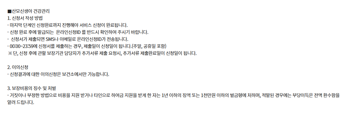 - 복지로 온라인 신청 경로: 복지로 로그인 > 서비스 신청 > 복지서비스 신청 > 복지급여 신청 > 임신출산 > 산모신생아 건강관리