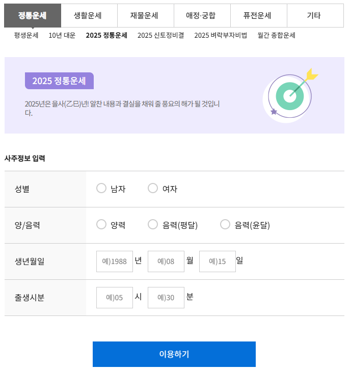 2025년 정통운세는 성별, 생년월일, 출생시분을 넣으면 여러가지 카테고리로 2025년 정통운세를 확인할 수 있습니다.
