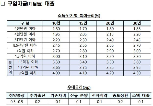 - 금리: 30년 만기 기준 1.85% ~ 4.3%, 청약저축 납입기간, 자녀수 등에 따른 우대금리 혜택