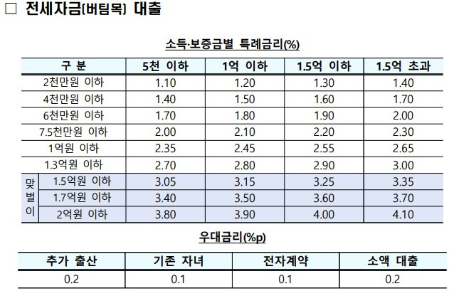 전세자금 대출은 소득과 보증금 수준에 따라 3.05~4.10%의 기본 금리로 제공됩니다.