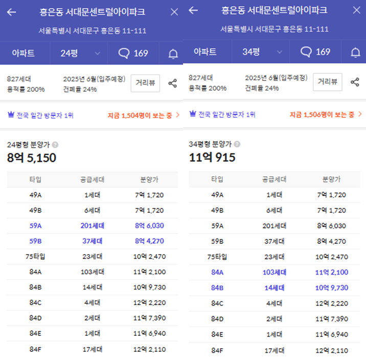 총 827 세대의 대단지로 구성되는 서대문 센트럴 아이파크는, 총 409세대가 일반 분양을 진행합니다.