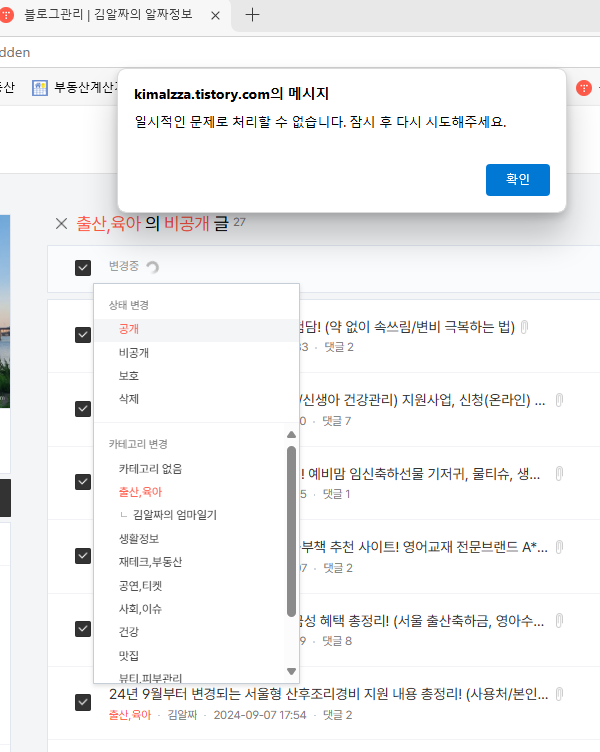 제가 최근에 블로그 글 정리를 좀 하게 되면서, 특정 카테고리의 글들을 모두 공개 > 비공개 처리를 하는 과정에서 해결되지 않는 티스토리 오류메시지 하나를 경험했습니다.