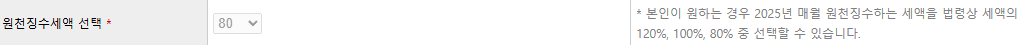 반면, 경제상황이 여유롭다면, 세율을 120%로 높게 설정해 향후 연말정산 시 세금을 추가 납부해야 하는 부담이나 번거로움을 미리 방지할 수도 있습니다.