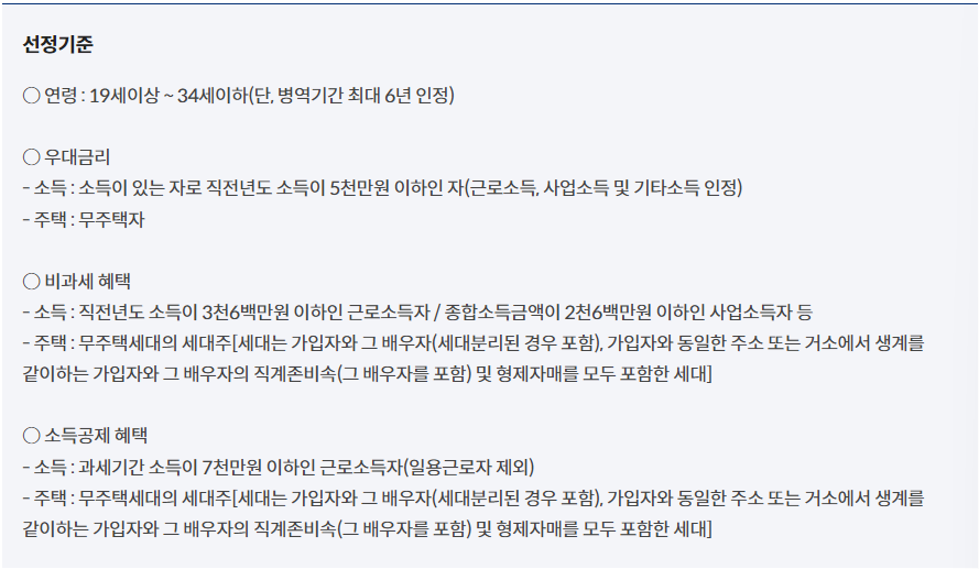 - 지원대상 : 19세 이상 ~ 34세 이하의 연 5천만원 이하의 소득 구간에 해당하는 무주택자