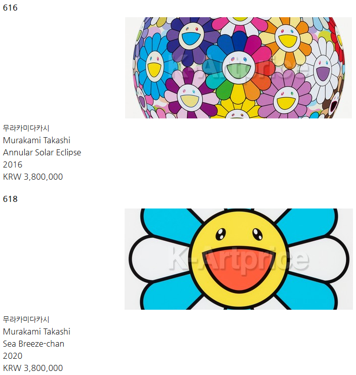 2013년에도, 무라카미의 회화는 대표작의 경우 중간 사이즈가 약 100만~150만달러, 대작의 경우 250만~300만 달러를 호가했습니다. 최근 K-Artprice 사이트에 공시된 가격을 보면, 최근 5년간 그의 작품 낙찰 건수는 541건이고, 낙찰액은 무려 20억원을 넘었습니다.