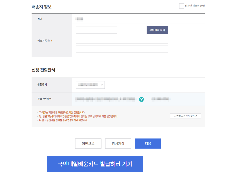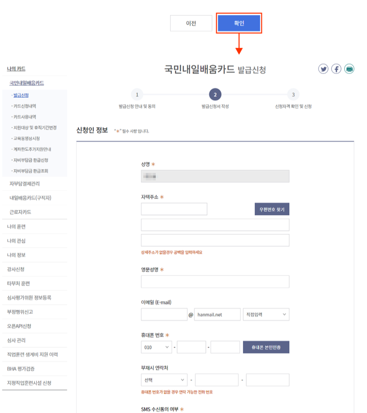 카드신청내영 확인법홈 > 나의정보(개인) > 나의카드 > 국민내일배움카드 > 카드신청내