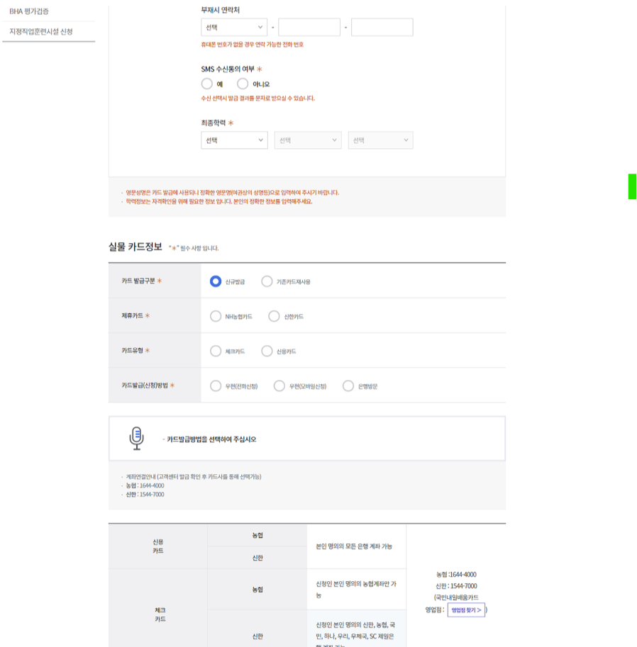 A. 카드는 농협/신한카드사에서 발급을 받을 수 있는데, 일반 신용카드나 체크카드와 같은 기능을 하면서, 훈련과정 결제 기능이 담긴 카드이기 때문에, 일반적인 카드처럼 한도가 있습니다.