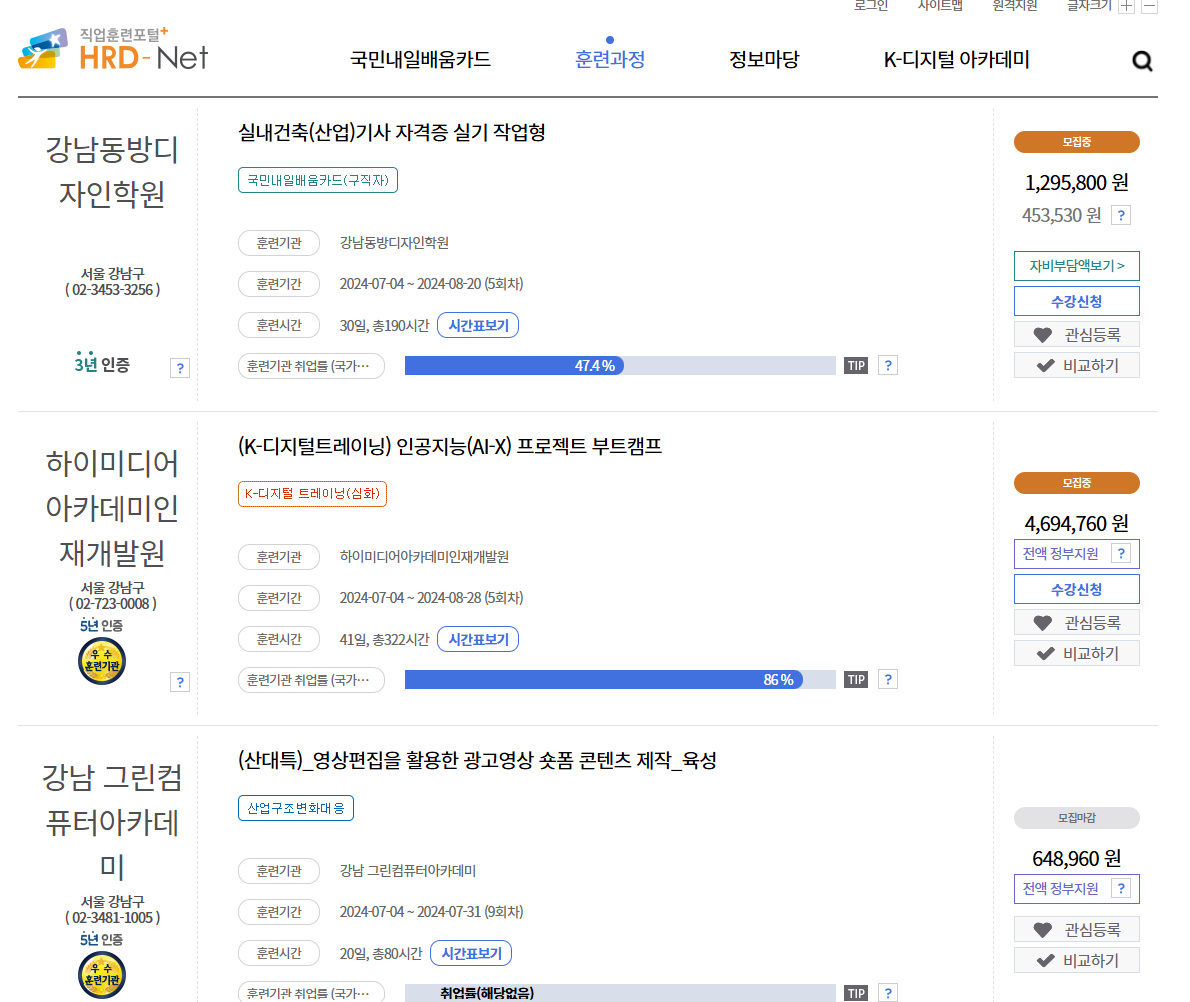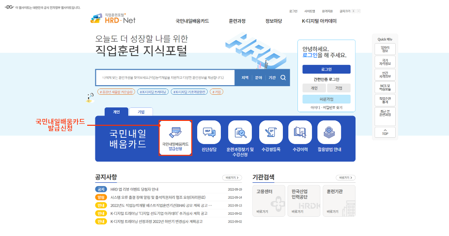 HRD-Net 에서 국민내일배움카드 훈련과정 검색 바로가기 ▼
