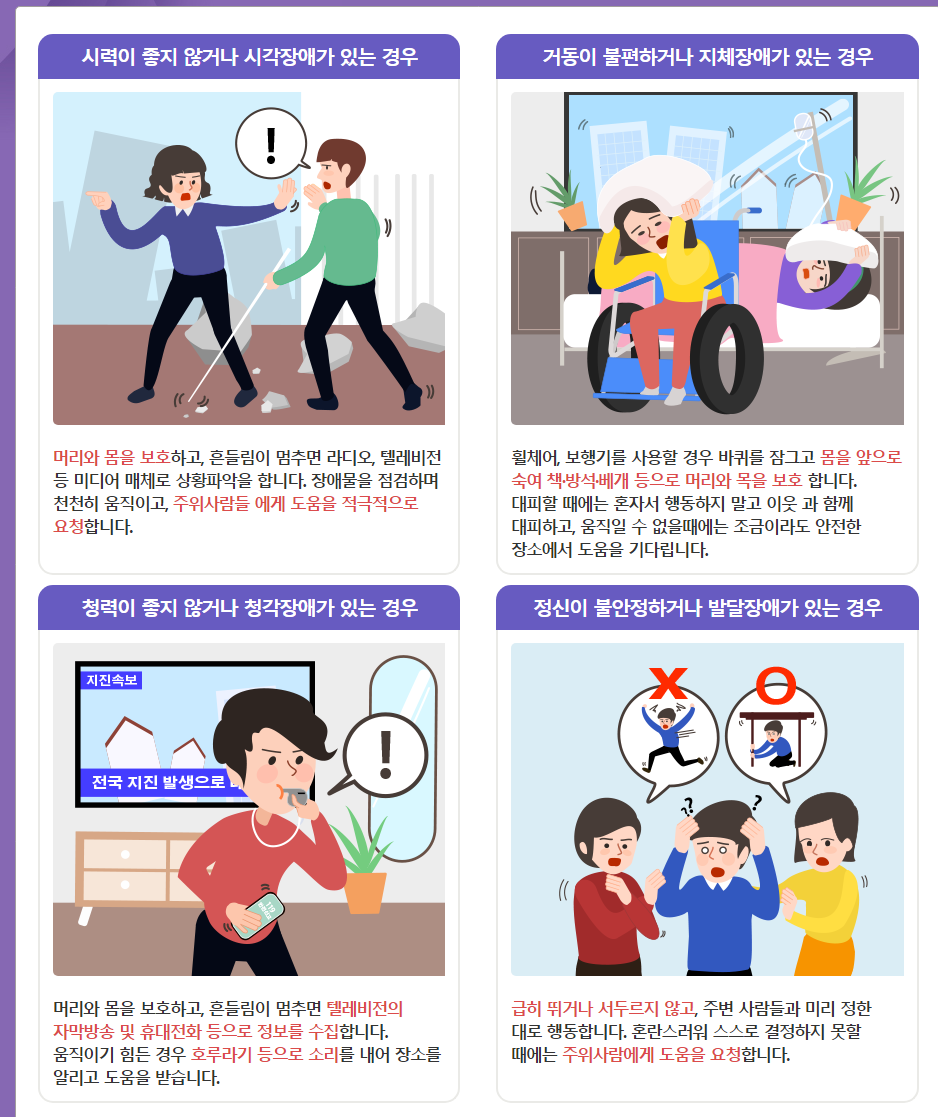 우선은 라디오나 텔레비전 등으로 상황 파악을 하고, 바닥에 낙하물이 있는지 장애물을 점검하며 천천히 움직입니다.